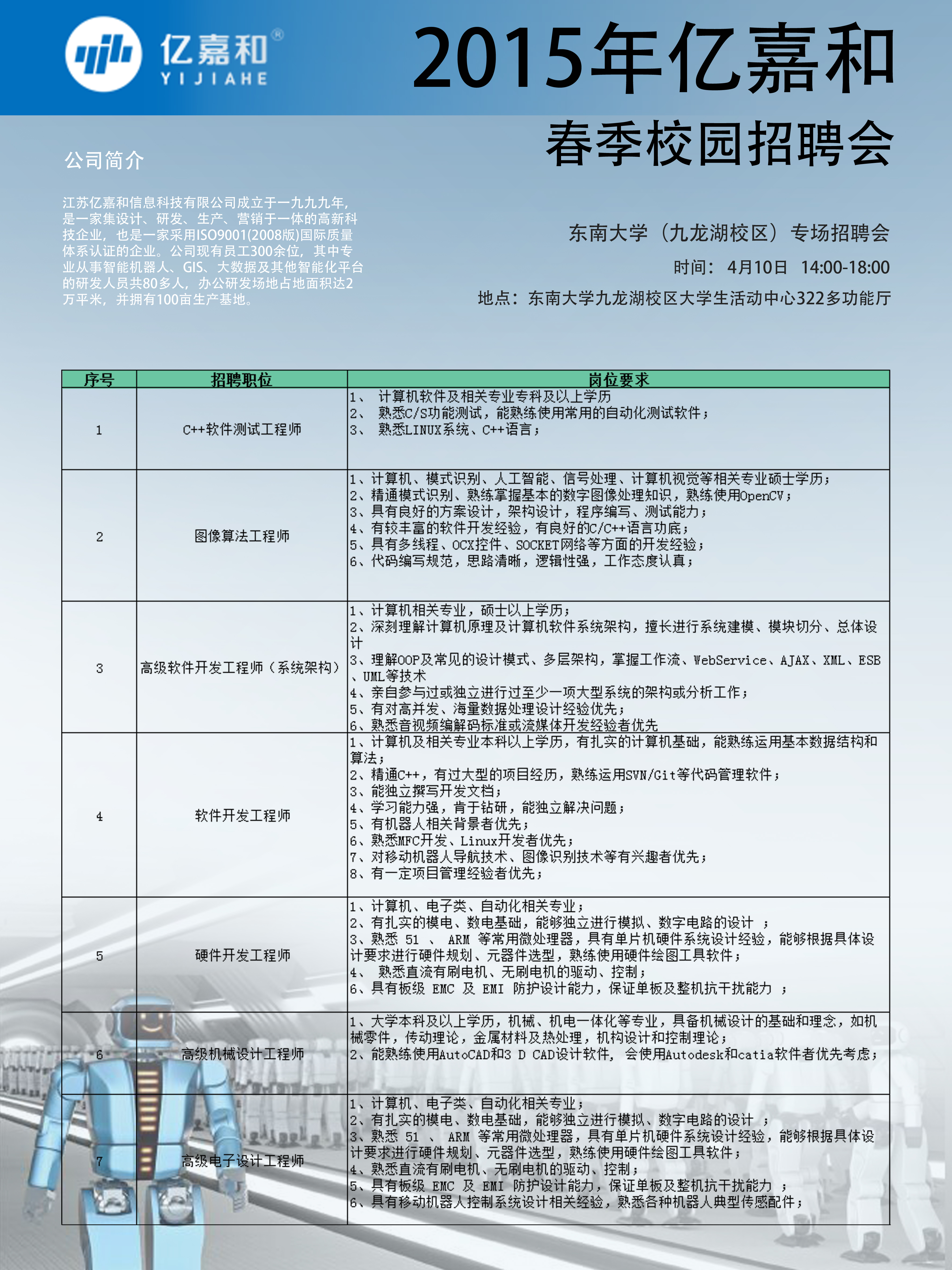 于4月10日下午14:00-18:00在东南大学九龙湖校区大学生活动中心322多功能厅召开“江苏亿嘉和信息科技有限公司校园招聘宣讲会”,