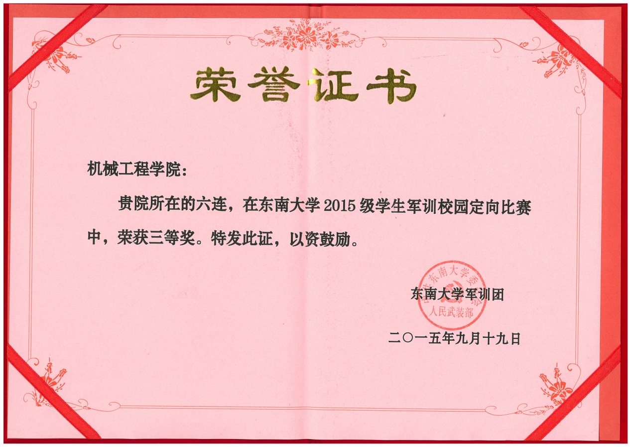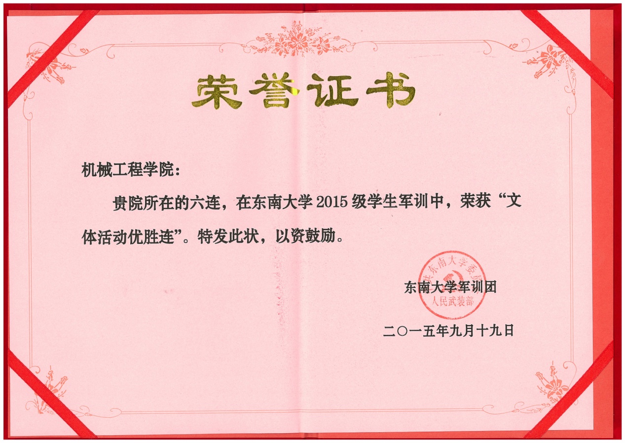 由机械工程学院与能源与环境学院组成的六连在此次军训中无疑成为一匹黑马脱颖而出,表现令人瞠目!从军事训练到文体活动再到内务卫生,六连的同学们都不甘示弱。在表彰之时,六连的名字一次又一次响起。六连赢得了“大满贯”——囊括了几乎所有的“第一”,他们以自己的实力,赢得了优胜连队,军事训练优胜连,宣传报道优胜连,文体活动优胜连,内务卫生优胜连。在各种比赛中,六连斩获拔河、合唱双项冠军,定向越野三等奖的成绩。辅导员梅仂盈、王瑜祥荣获优秀指导员称号。吴荣承等52名同学获得优秀学员。宋景晖,陶丰两位摄像师所拍摄的精美照片斩获四项大奖,三名同学赢得了征文比赛的奖项。