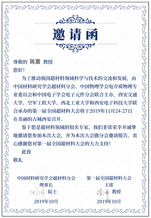 第一届全国超材料大会于2019年11月24 ~ 27日在美丽古都西安召开,半岛线上平台的陈震教授受邀参加大会并作特邀报告。
