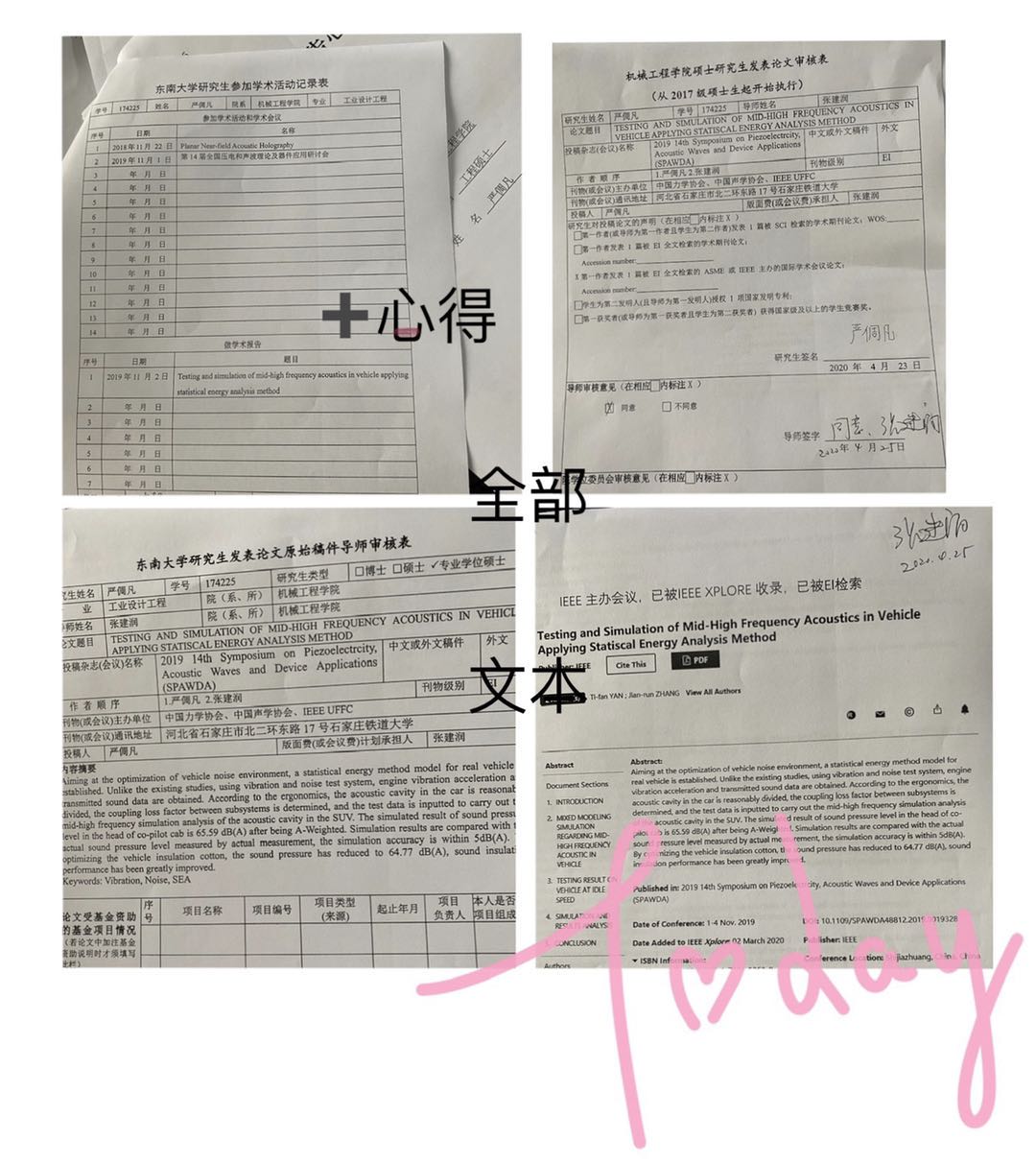《东南大学研究生发表论文原始稿件导师审核表》(网上下载)---学生本人、导师签名;