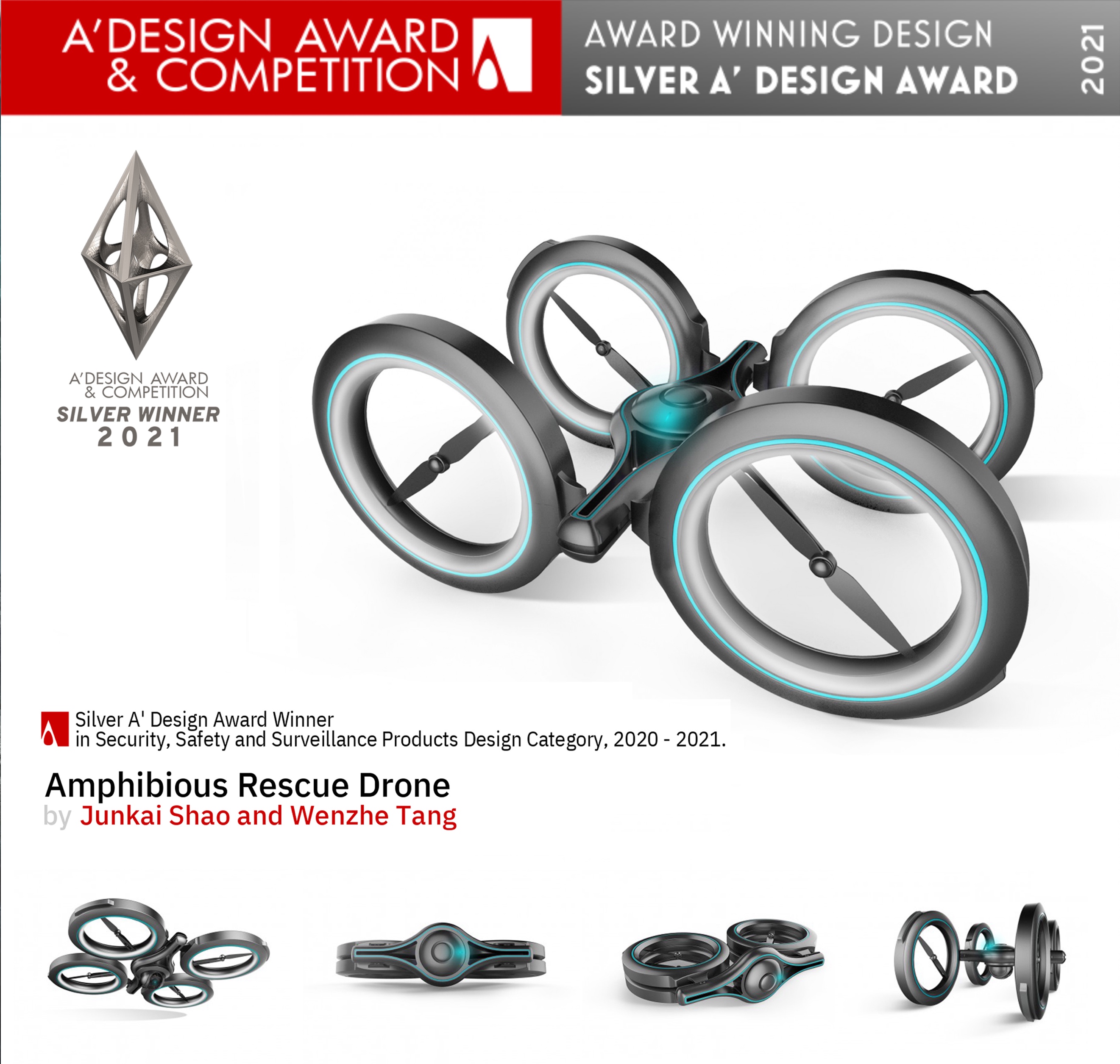 近日,全球设计界备受瞩目的A' Design Award 2021设计大奖揭晓,由半岛线上平台工业设计专业17级博士生邵俊凯、18级博士汤文哲设计,薛澄岐教授指导的作品“Amphibious Rescue Drone”,从全球108个国家和地区的20000多份参赛作品中脱颖而出,经过211位具有国际影响力的知名学者、著名媒体成员、创意设计专业人士和有丰富经验的企业家组成的评审团严格评审,斩获“2021 A' Design Award银奖”。