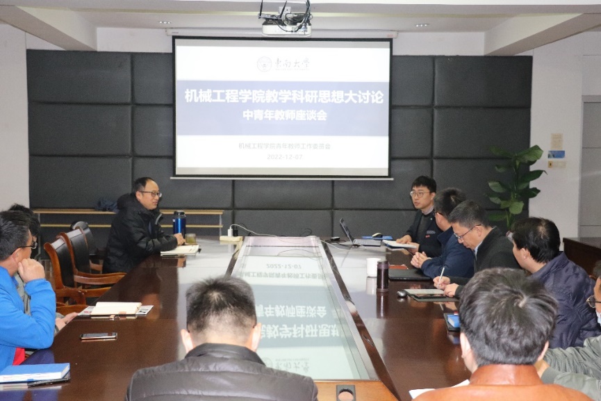 为充分落实立德树人的东大使命和生为首位的东大行动,机械工程学院青委会于12月7日下午在南高厅组织开展了教学科研思想大讨论--中青年教师座谈会活动。院长倪中华、党委副书记兼副院长王斌、副院长毕可东、副院长刘晓军、副院长陈震以及学院50余位青年教师参加了本次座谈会。会议由学院院长倪中华主持。