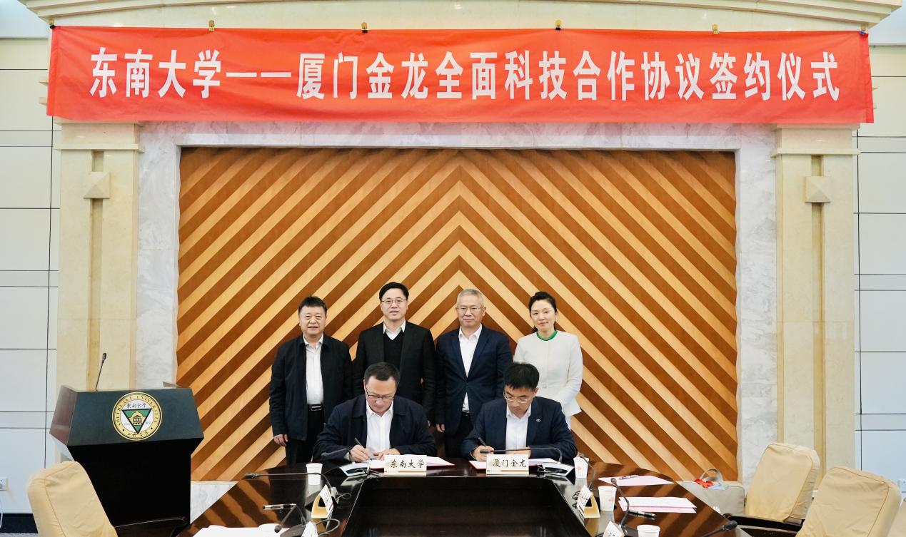 2023年4月1日,厦门金龙联合汽车工业有限公司党委书记、董事长刘志军一行到东南大学访问,双方进行了合作洽谈并签署了全面科技合作协议。东南大学常务副校长吴刚、江苏省工信厅产业转型升级处(省汽车工业办公室)处长熊斌谦、中国汽车工程学会副秘书长赵莲芳,学校各相关职能部门及院系有关负责同志参加了签约仪式。