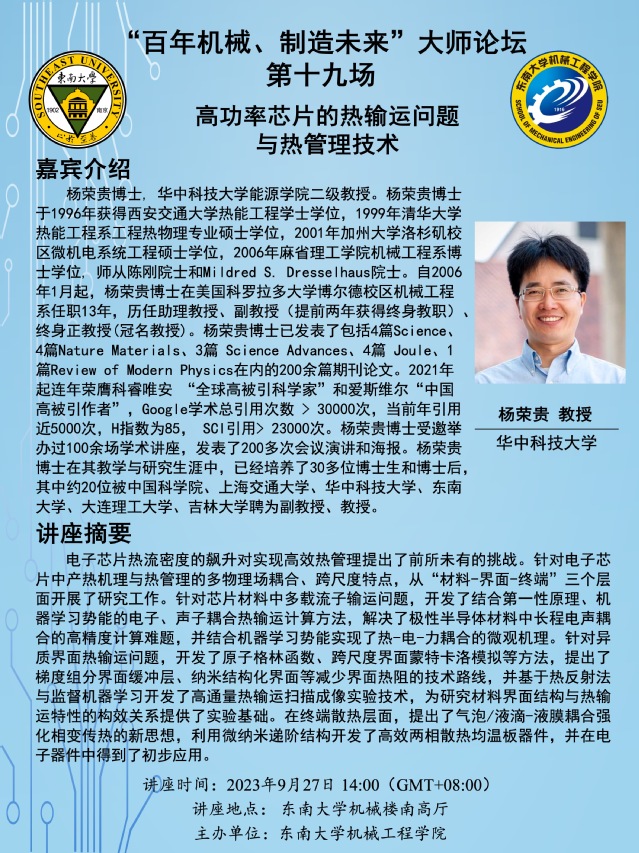 杨荣贵博士, 华中科技大学能源学院二级教授。杨荣贵博士于1996年获得西安交通大学热能工程学士学位,1999年清华大学热能工程系工程热物理专业硕士学位,2001年加州大学洛杉矶校区微机电系统工程硕士学位,2006年麻省理工学院机械工程系博士学位, 师从陈刚院士和Mildred S. Dresselhaus院士。自2006年1月起,杨荣贵博士在美国科罗拉多大学博尔德校区机械工程系任职13年,历任助理教授、副教授(提前两年获得终身教职)、终身正教授(冠名教授)。杨荣贵博士已发表了包括4篇Science、4篇Nature Materials、3篇 Science Advances、4篇 Joule、1篇Review of Modern Physics在内的200余篇期刊论文。2021年起连年荣膺科睿唯安 “全球高被引科学家”和爱斯维尔“中国高被引作者”,Google学术总引用次数 > 30000次,当前年引用近5000次,H指数为85, SCI引用> 23000次。杨荣贵博士受邀举办过100余场学术讲座,发表了200多次会议演讲和海报。杨荣贵博士在其教学与研究生涯中,已经培养了30多位博士生和博士后,其中约20位被中国科学院、上海交通大学、华中科技大学、东南大学、大连理工大学、吉林大学聘为副教授、教授。