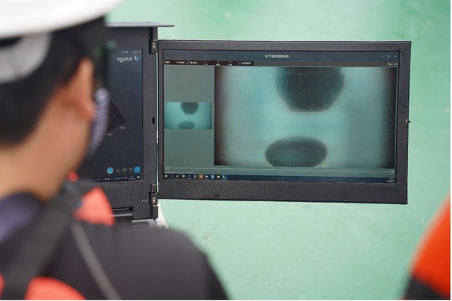 本次夜间作业海况复杂、光线不足且水质浑浊,蛙人等传统水下观测方式严重受限,甚至无法正常工作。在上述恶劣条件下,联合团队利用最新研制的水下增强观测系统对导管架施工核心环节--导管架插桩施工过程进行全程跟踪和偏差修正数据实时反馈,保障插桩过程在十几分钟内一步到位,在确保施工质量的同时大大提升了施工效率和安全。