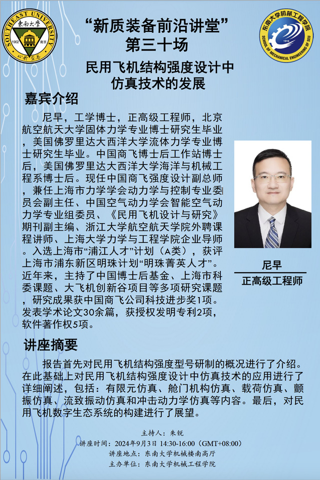 尼早,工学博士,正高级工程师,北京航空航天大学固体力学专业博士研究生毕业,美国佛罗里达大西洋大学流体力学专业博士研究生毕业。中国商飞博士后工作站博士后,美国佛罗里达大西洋大学海洋与机械工程系博士后。现任中国商飞强度设计副总师,兼任上海市力学学会动力学与控制专业委员会副主任、中国空气动力学会智能空气动力学专业组委员、《民用飞机设计与研究》期刊副主编、浙江大学航空航天学院外聘课程讲师、上海大学力学与工程学院企业导师。入选上海市“浦江人才”计划(A类),获评上海市浦东新区明珠计划“明珠菁英人才”。近年来,主持了中国博士后基金、上海市科委课题、大飞机创新谷项目等多项研究课题,研究成果获中国商飞公司科技进步奖1项。发表学术论文30余篇,获授权发明专利2项,软件著作权5项。