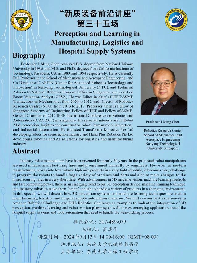 Professor I-Ming Chen received B.S. degree from National Taiwan University in 1986, and M.S. and Ph.D. degrees from California Institute of Technology, Pasadena, CA in 1989 and 1994 respectively. He is currently Full Professor in the School of Mechanical and Aerospace Engineering, and Co-Director of CARTIN (Center for Advanced Robotics Technology and Innovation) in Nanyang Technological University (NTU), and Technical Advisor to National Robotics Program Office in Singapore, and Certified Patent Valuation Analyst (CPVA). He was Editor-in-chief of IEEE/ASME Transactions on Mechatronics from 2020 to 2022, and Director of Robotics Research Centre (NTU) from 2013 to 2017. Professor Chen is Fellow of Singapore Academy of Engineering, Fellow of IEEE and Fellow of ASME, General Chairman of 2017 IEEE International Conference on Robotics and Automation (ICRA 2017) in Singapore. His research interests are in Robot AI & perception, logistics and construction robots, human-robot interaction, and industrial automation. He founded Transforma Robotics Pte Ltd developing robots for construction industry and Hand Plus Robotics Pte Ltd developing robotics and AI solutions for logistics and manufacturing industry.