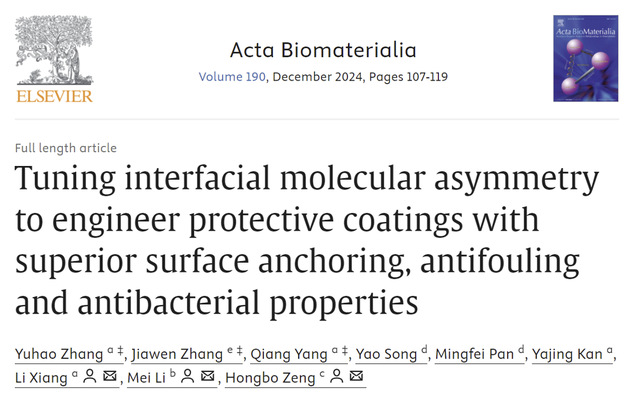 近日,我院2023级硕士研究生张宇浩在生物材料期刊《Acta Biomaterialia》(中科院一区,IF=9.4)发表题为“Tuning Interfacial Molecular Asymmetry to Engineer Protective Coatings with Superior Surface Anchoring, Antifouling and Antibacterial Properties”的研究成果,设计了一种稳定防污抗菌的分子不对称结构涂层用于保护植入式生物医学设备。(论文链接:https://doi.org/10.1016/j.actbio.2024.10.015)