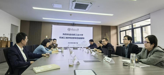 2025 年 3 月 27 日,合肥工业大学机械工程学院党委书记祖磊,副院长马培勇、赵萍,党委副书记兼纪委书记蔡伟伟,党政办公室主任陈华等一行莅临我院调研交流工作。学院党委书记王军,院长费庆国,党委副书记彭龙,副院长王乾乾、刘晓军,办公室主任洪思偲参加了交流会。
