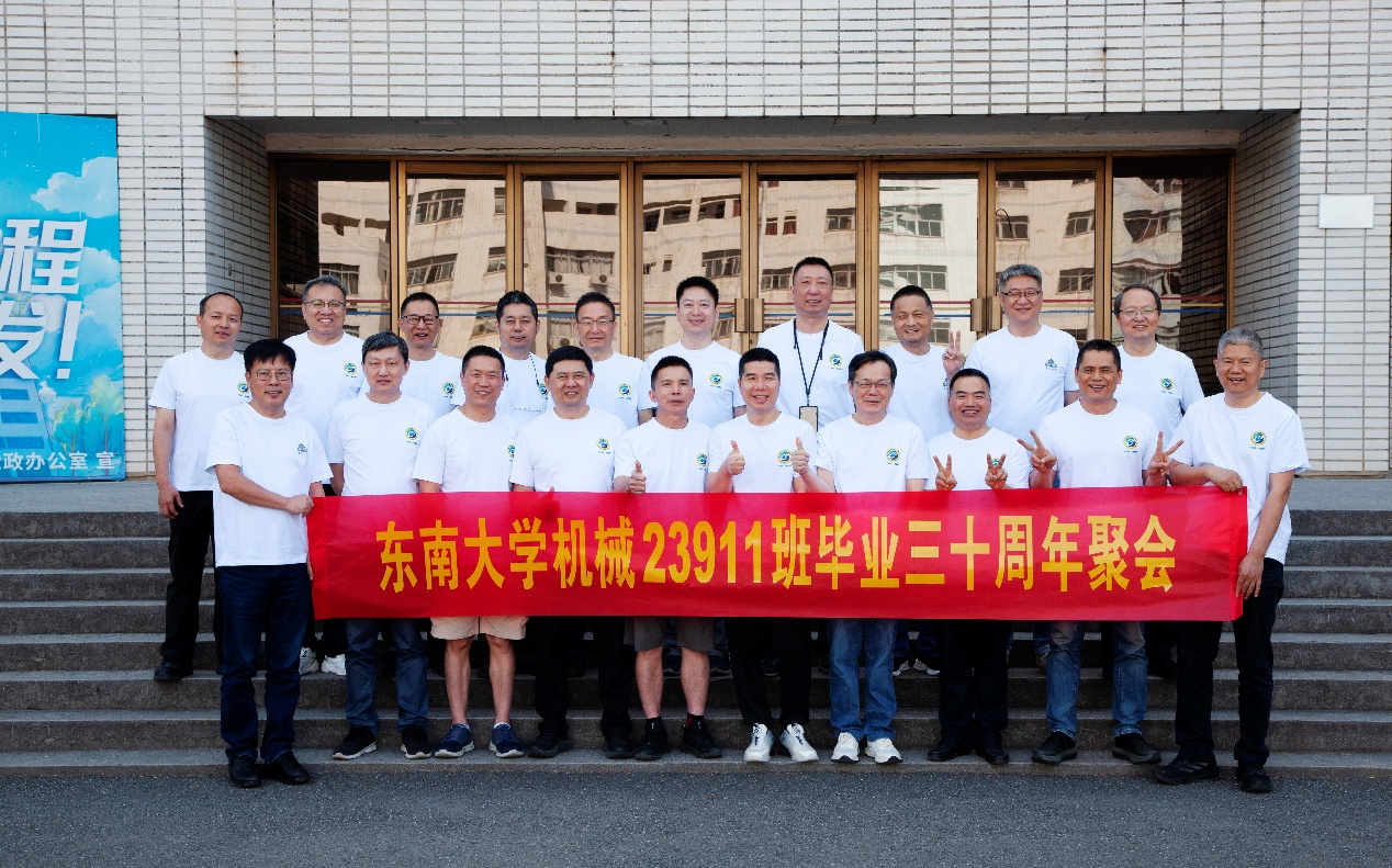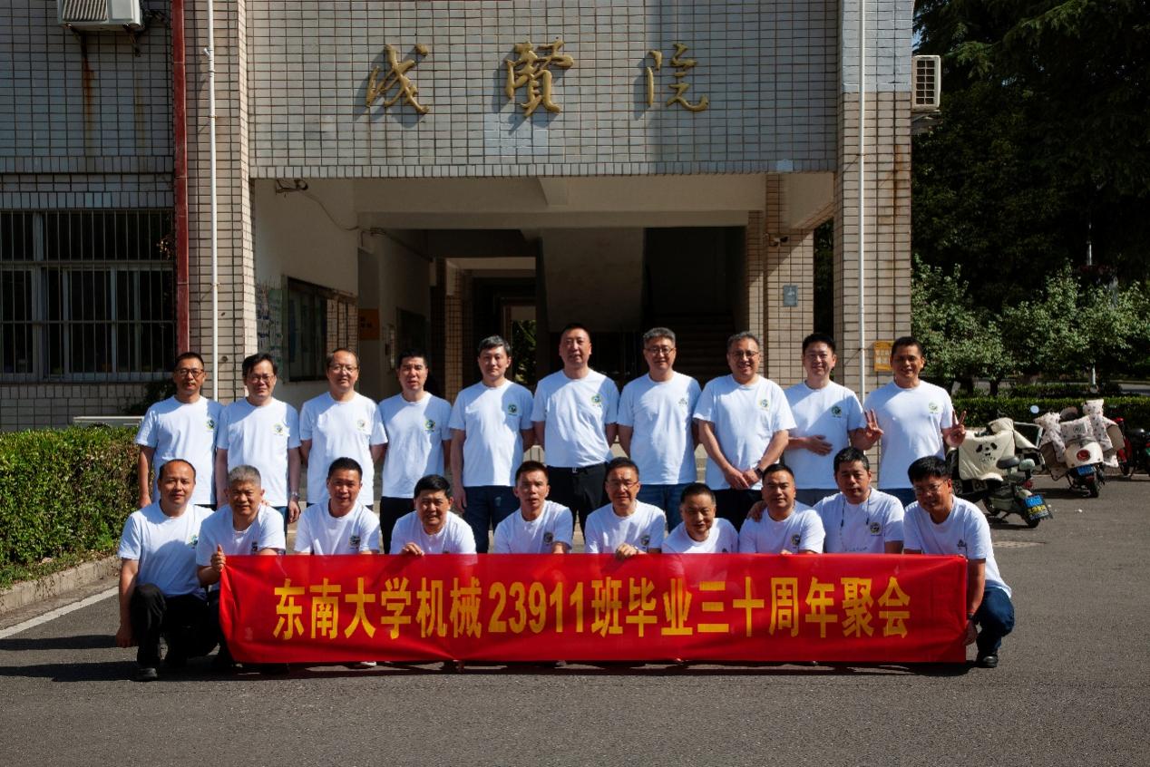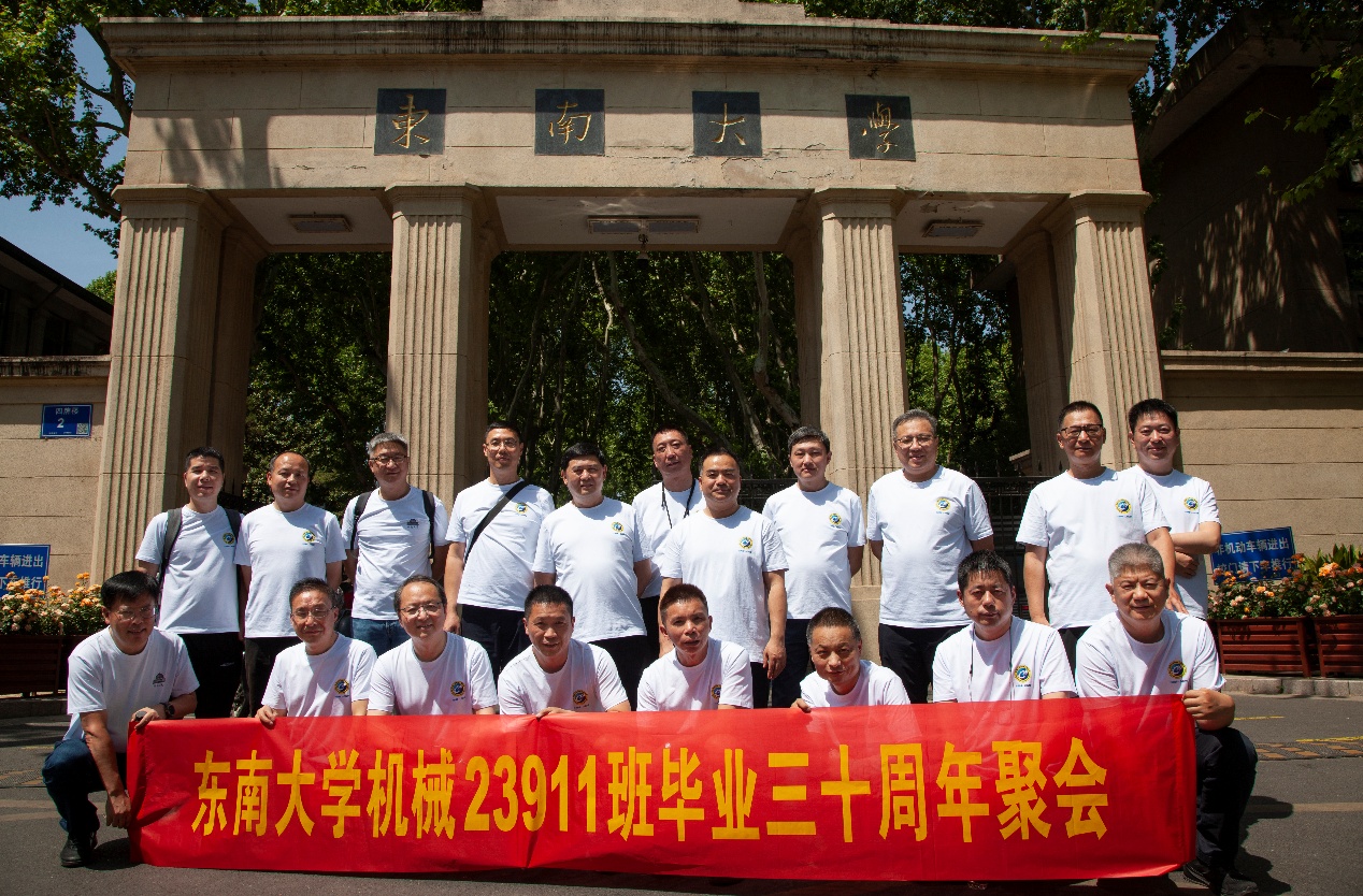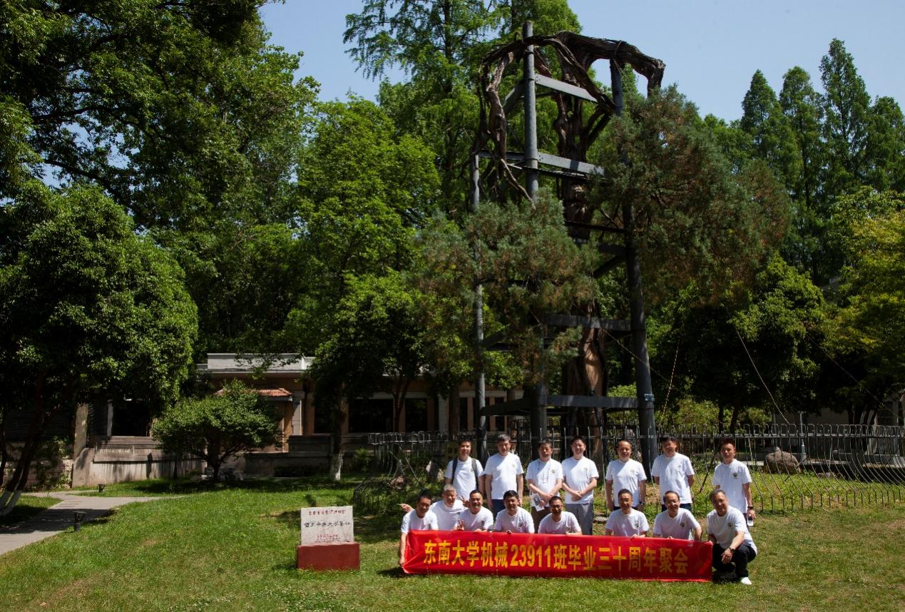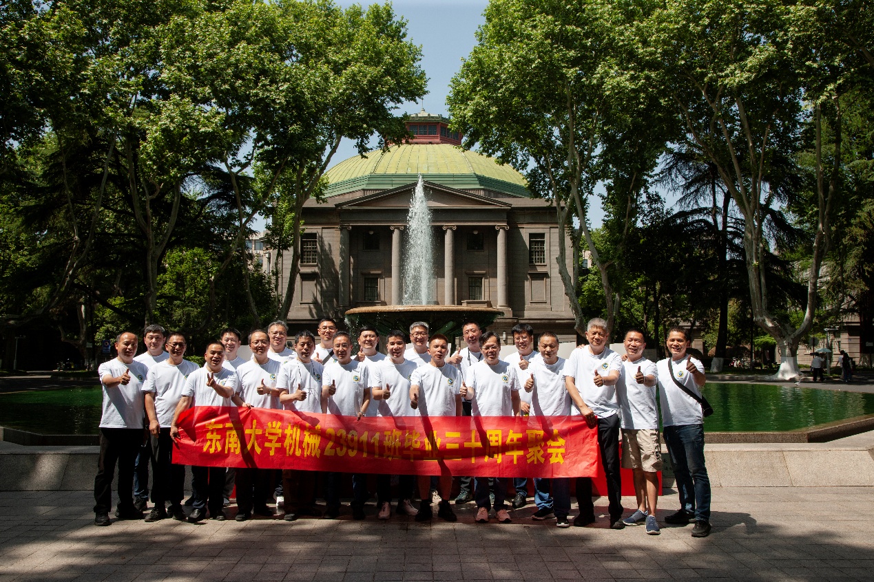 次日早上,校友们共赴历史底蕴深厚的四牌楼校区,回到这个大家共同生活了三年的地方。天公作美,是日校园内花红树绿、群莺乱飞。大家参观了庄重典雅的大礼堂、凝结科学精神的吴健雄纪念馆、充满活力与汗水的体育馆、郁郁葱葱的六朝松,大家在南高院前、六朝松下、老图书馆旁、正南门前,一次次驻足、一次次合影。每一处景致,都唤醒了大家埋藏心底的大学记忆。参观完毕,大家在中山院108教室重开一次久别重逢的班会,同学们轮流分享着毕业三十年来的人生感悟,同忆往事、共展未来,无论是深耕机械行业、成为国之重器的中坚力量,抑或是跨界发展、大家在各行各业各尽其力、努力工作。言语间,大家都流露出对母校栽培的感恩,对同窗情谊的珍视,以及对母校和机械学院的无限期盼。班级同学共同做出的一个重要决定:设立“23911教育基金”!同学们承诺,将每年捐赠1万元,连续10年,专项用于资助机械工程学院2名品学兼优的优秀学生。此虽微薄之力、小小善举,却是同学们饮水思源的拳拳之心。大家共同期望,“23911教育基金”的设立,能化作一股源源不断的动力,激励着新一代机械学子奋发图强,勇攀科技高峰,为母校增光添彩!