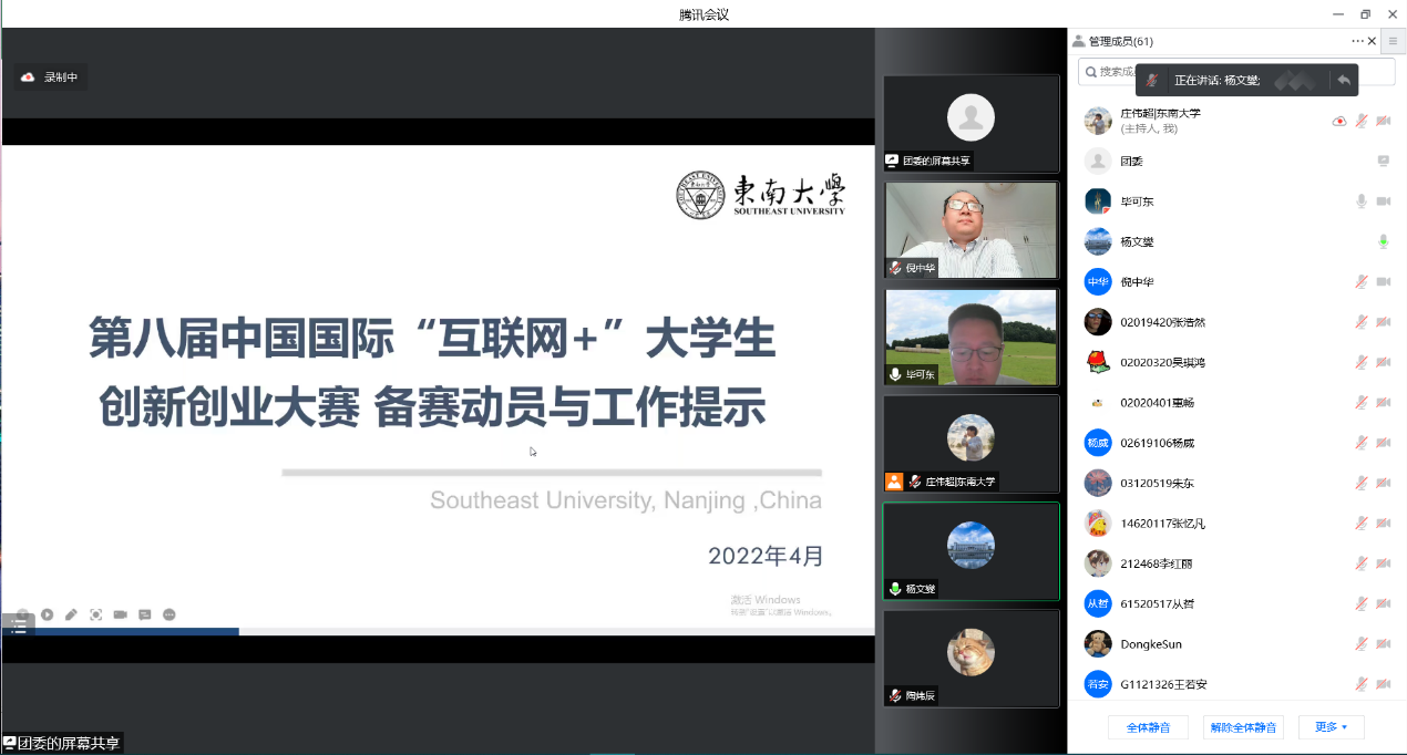为激励全院师生积极参与中国国际“互联网+”大学生创新创业大赛,推动“以赛促学”、“以赛促教”、“以赛促创”,提升参赛项目综合质量,机械工程学院于4月17日上午在线上召开了“互联网+”大学生创新创业大赛宣讲会。会议邀请了校教务处处长殷国栋和校团委副书记兼党委研工部副部长、党委学工部副部长杨文燮对“互联网+”大赛进行了备赛解析和经验分享,学院领导和师生参加宣讲会。
