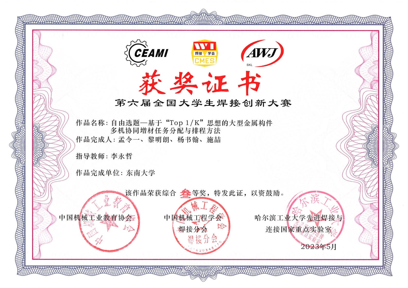 在学校教务处、机械工程学院的大力支持下,本届大赛东南大学代表队由刘小超副教授、李永哲副教授带队参加全国决赛,刘小超副教授受邀担任自由命题组评委。经过紧张激烈的比赛,我校由张泰瑞、王青华两位老师指导,豆文欢、李超红、陆凯佳、钱睿4位同学的项目《基于超级双相不锈钢激光熔覆硬质合金层的船舶复合板制备》获固定命题一等奖;由刘小超老师指导,罗璟玥、万宇、包文辉、李瑞茹4位同学的项目《基于搅拌-涡流-机械互锁的复合摩擦焊界面的金属异质构件增材制造技术研究》获自由命题二等奖;由李永哲老师指导,孟令一、黎明朗、杨书翰、施喆4位同学的项目《基于“Top 1/K”思想的大型金属构件多机协同增材任务分配与排程方法》、由裴宪军老师指导,张龙怀、蔡路、王郑、杨宇轩4位同学的项目《抗屈曲纤焊复合结构设计》分别获得自由命题和固定命题三等奖。