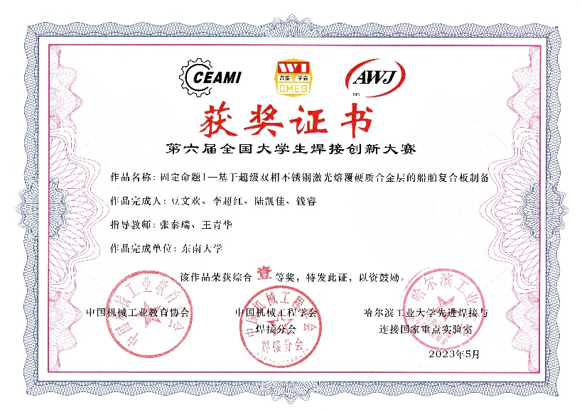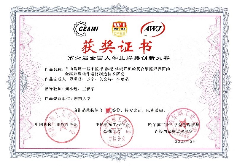 2023526日至28日,第六届全国大学生焊接创新大赛暨第四届焊接技术与工程专业委员会成立大会在河南科技大学成功举办。本次大赛由中国机械工业教育协会、中国机械工程学会焊接分会、哈尔滨工业大学先进焊接与连接国家重点实验室主办。东南大学本届大赛共派出4支队伍参赛,最终获得一等奖1项、二等奖1项、三等奖2项。