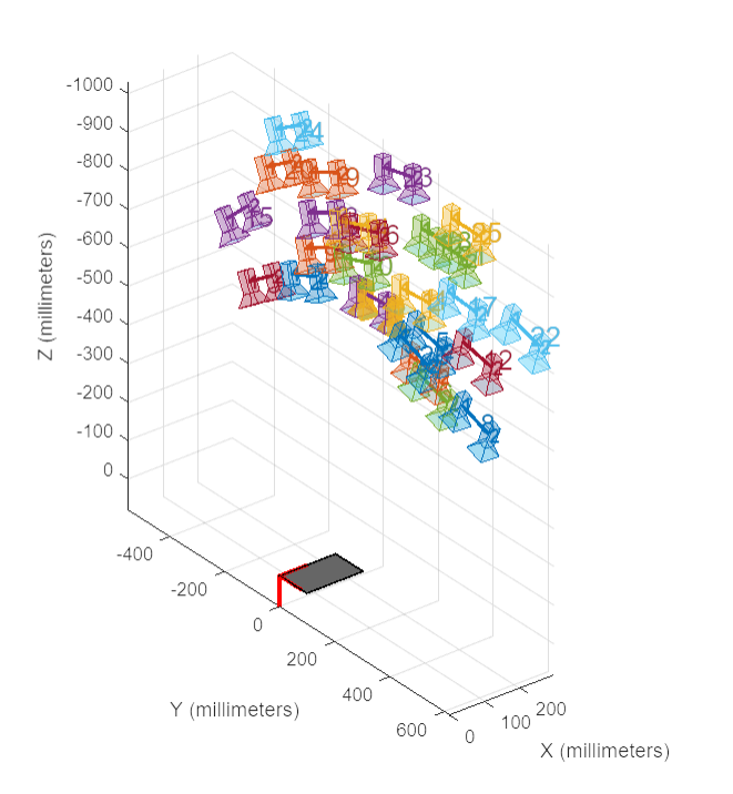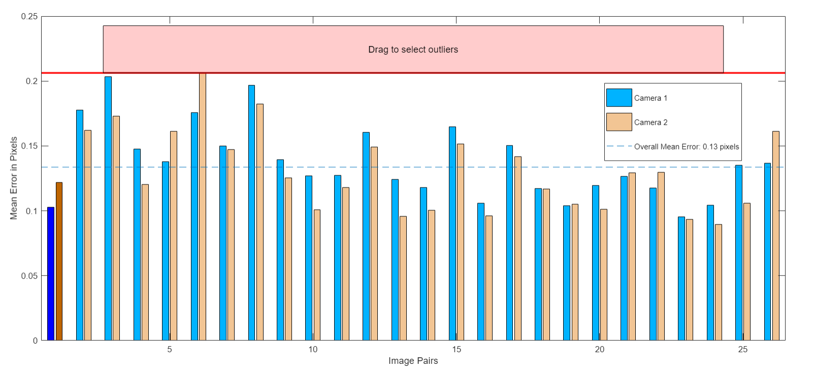 2. 参数采集。使用matlab工具箱提供的应用“stereo camera calibrator”进行双目标定,将图片标定结果保存到matlab工作区,删去误差较大的图组后,通过编写程序将主要参数excel形式导出。